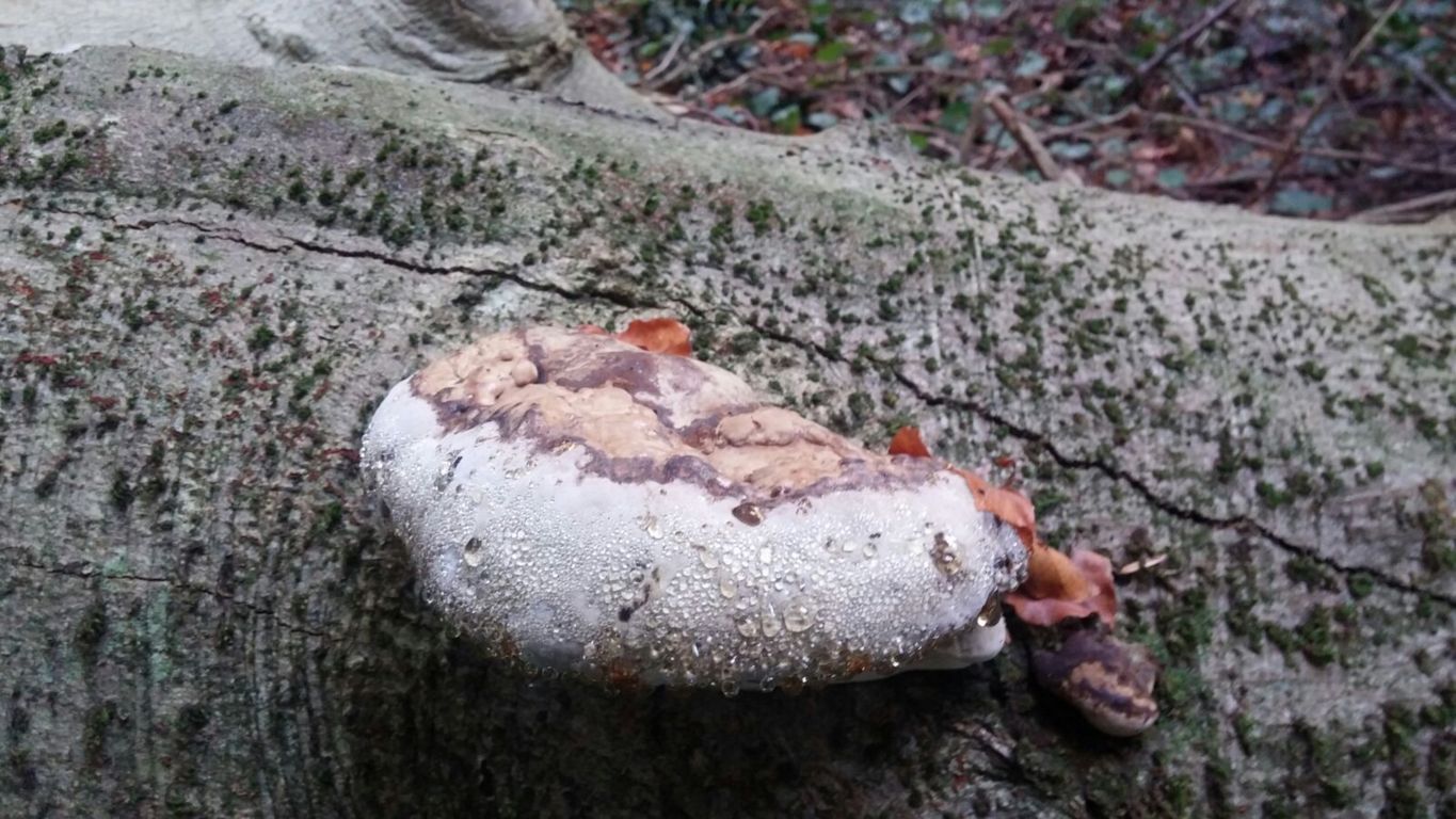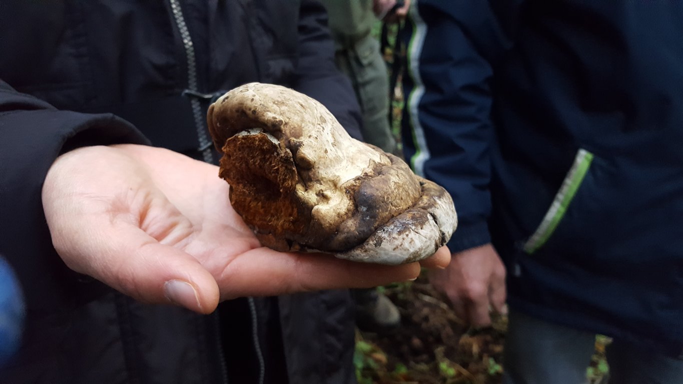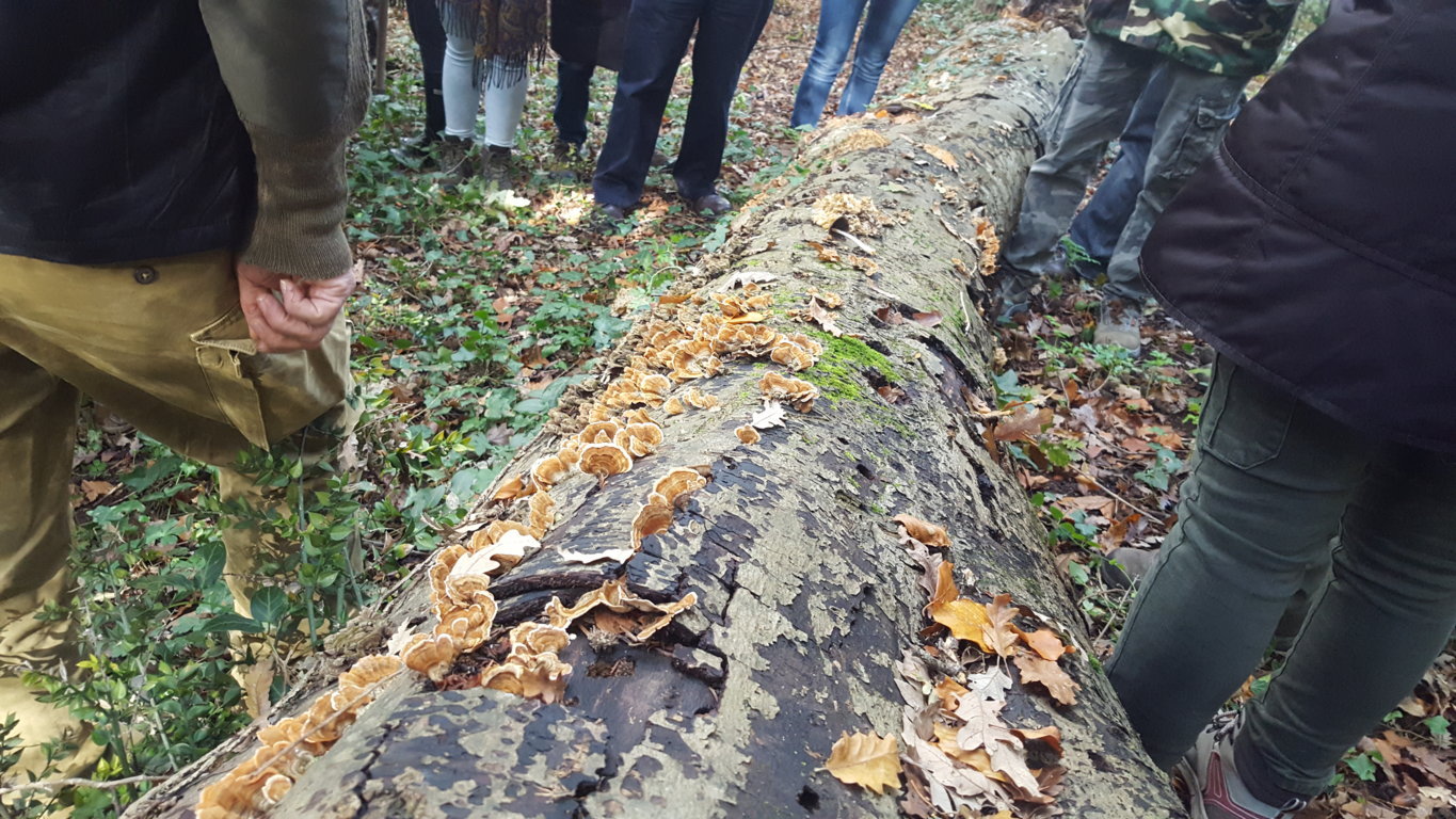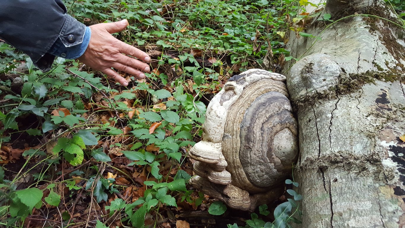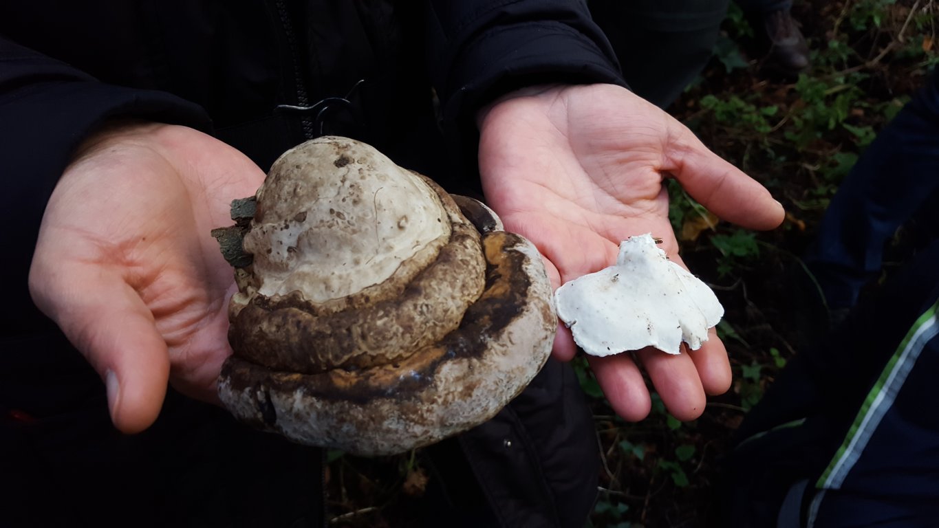 Il bosco ci presenta diverse poliporaceae come la Postia stiptica dall’inequivocabile sapore astringente, Ganoderma applanatum, Polyporus picipes, Trametes versicolor, Fomes fomentarius. Quest’ultimo desta molta curiosità quando viene descritto come elemento ritrovato nel corredo di sopravvivenza di Otzi, la mummia di Similaun che, nel IV millennio a.C. se ne serviva come esca di innesco per accendere il fuoco (qualità che conferisce il nome al fungo).