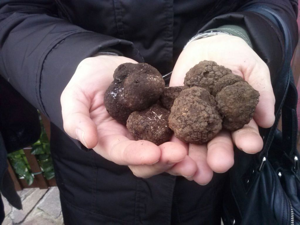 1, 2, enne tartufi si materializzano nelle nostre mani, preziosi doni della terra. Il profumo è gradevole, l’esoperidio bruno-nerastro è percorso da verruche piramidali sporgenti. Sono Tuber aestivum. Obiettivo raggiunto!
